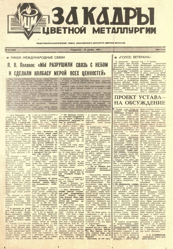 - П. В. Поляков: "Мы разрушили связь с небом и сделали колбасу мерой всех ценностей" : [интервью с зав. кафедрой металлургии легких металлов и производства глинозема П. В. Поляковым о поездках за границу]. — С. 1,2.