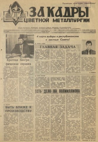 За кадры цветной металлургии : газета. 1990 г. № 3 (1241) (22 февраля)выпуск журнала/газеты