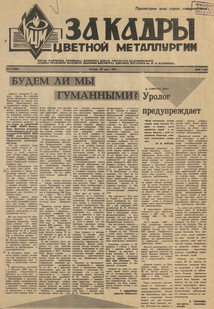 За кадры цветной металлургии : газета. 1990 г. № 9 (1247) (29 июня)выпуск журнала/газеты