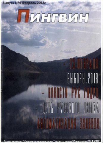 Пингвин : газета сектора "Информация и реклама" (пресс-центр) Студсовета СШФ СФУ. 2018 г. № 4 (февраль)выпуск журнала/газеты