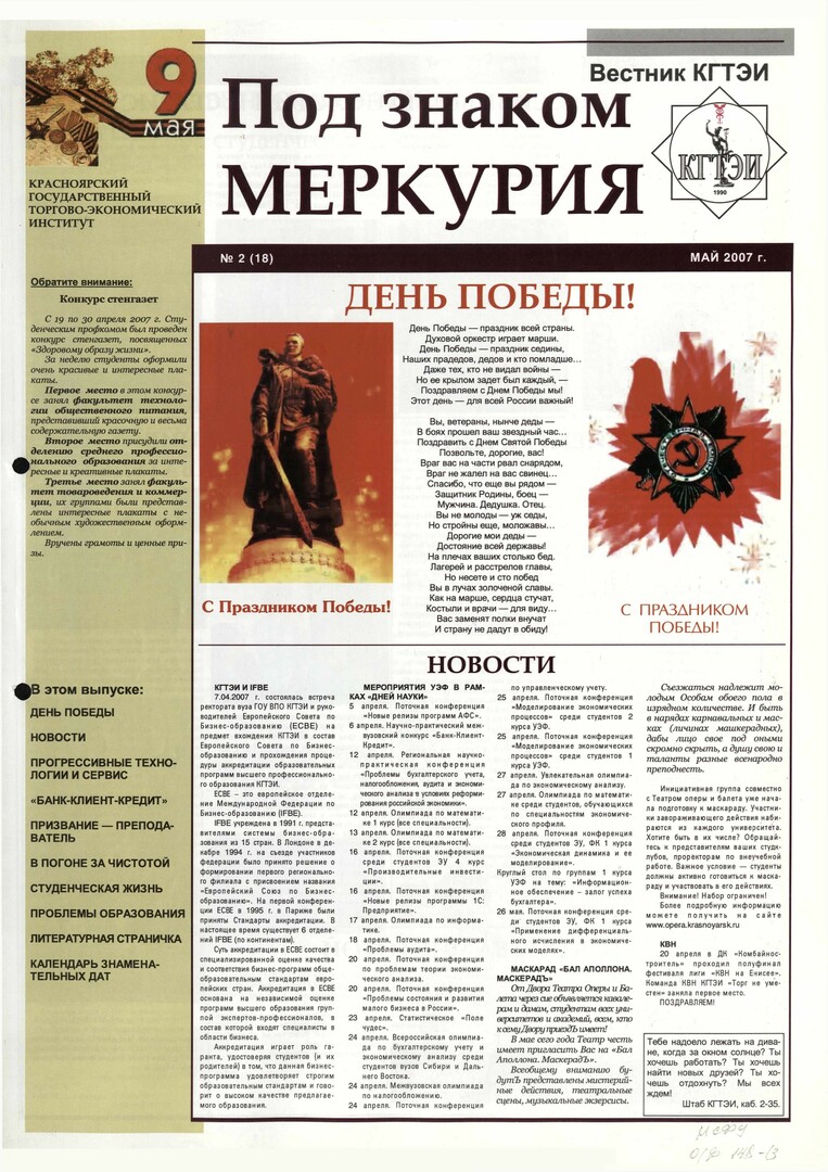 - Новости : [встреча ректора КГТЭИ и руководителей Европейского Совета по Бизнес-образованию (ЕСВЕ) (01.04.2007), мероприятия УЭФ в рамках "Дней науки" (05.04. -26.05.2007), маскарад "Бал Апполона. МаскерадЪ", КВН КГТЭИ (20.04.2007)]. — С. 1.