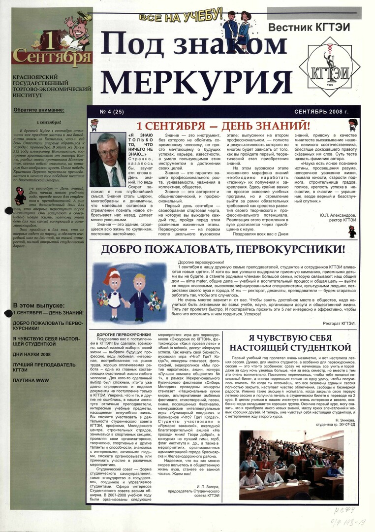 - 1 сентября - День знаний! : [напутствие и поздравление ректора КГТЭИ]. — С. 1.