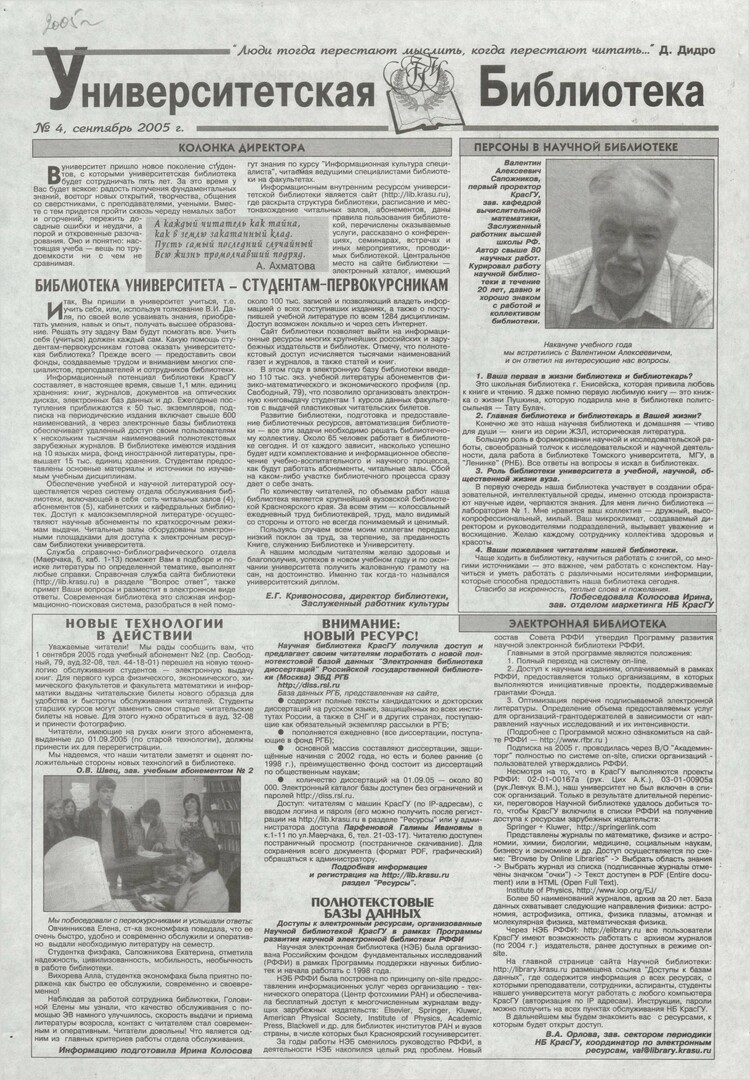 Университетская библиотека : газета. 2005 г. № 4 (сентябрь)выпуск журнала/газеты