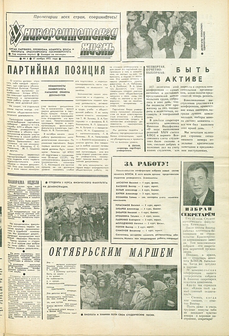 - Избран секретарем [комитета комсомола КрасГУ - Виктор Басенко, студент юридического факультета]. — С. 1.фото Г. А. Романюты