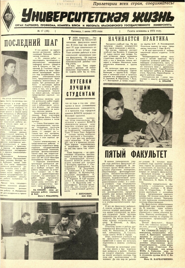 Университетская жизнь : газета. 1973 г. № 17 (28) (1 июня)выпуск журнала/газеты
