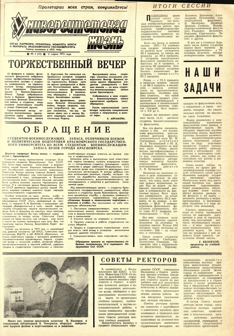 Университетская жизнь : газета. 1973 г. № 4 (15) (2 марта)выпуск журнала/газеты