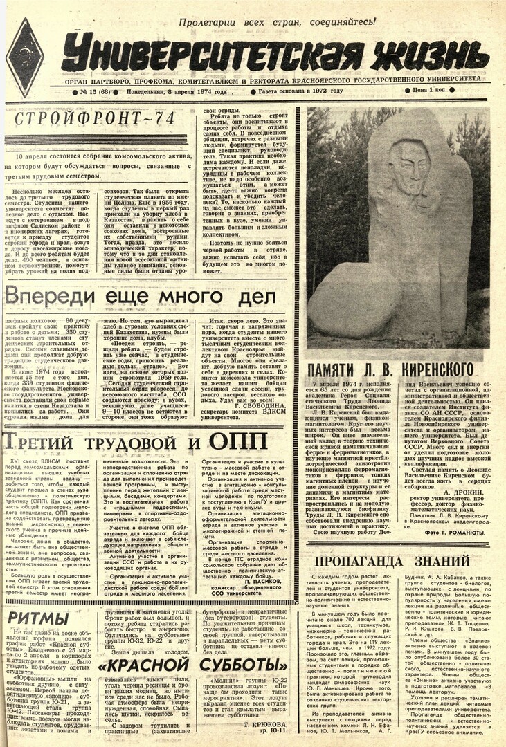 Университетская жизнь : газета. 1974 г. № 15 (68) (8 апреля)выпуск журнала/газеты
