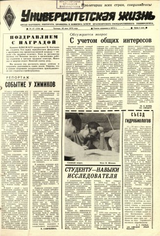- Съезд гидробиологов : [участие представителей КрасГУ в III съезде Всесоюзного гидробиологического общества (Рига, май 1976 г.)]. — С. 1.