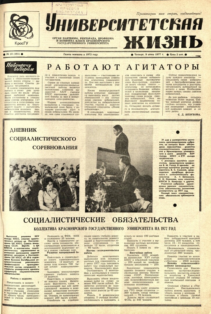 Библиографическое описание:Университетская жизнь : газета / Красноярский государственный университет. - Красноярск : КрасГУ, 1972 - - 2006 1977г. N 18 (161) (9 июня)