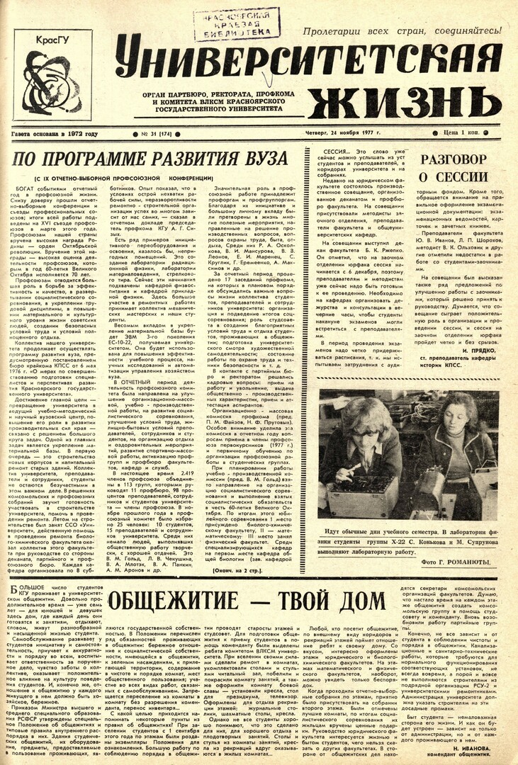 Библиографическое описание:Университетская жизнь : газета/ Красноярский государственный университет. - Красноярск : КрасГУ, 1972 - - 2006 1977г. N 31 (174) (24 ноября)