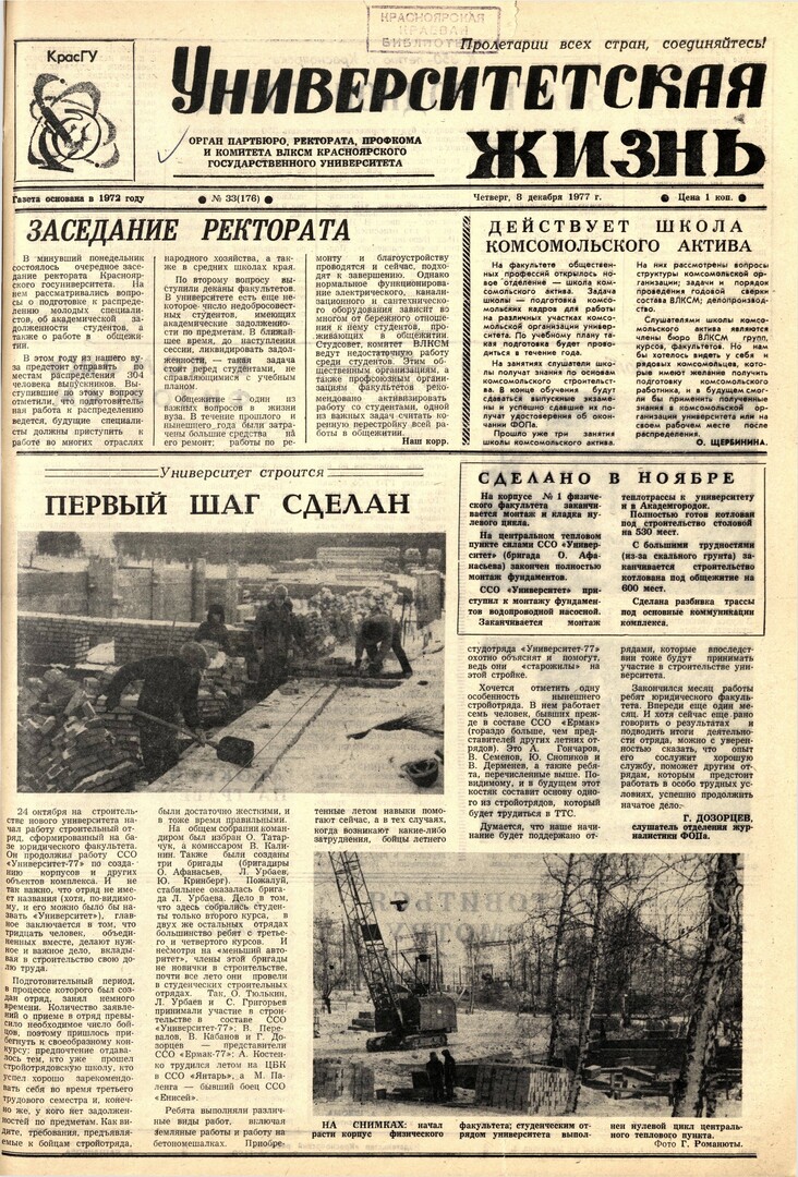 Библиографическое описание:Университетская жизнь : газета/ Красноярский государственный университет. - Красноярск : КрасГУ, 1972 - - 2006 1977г. N 33 (176) (8 декабря)