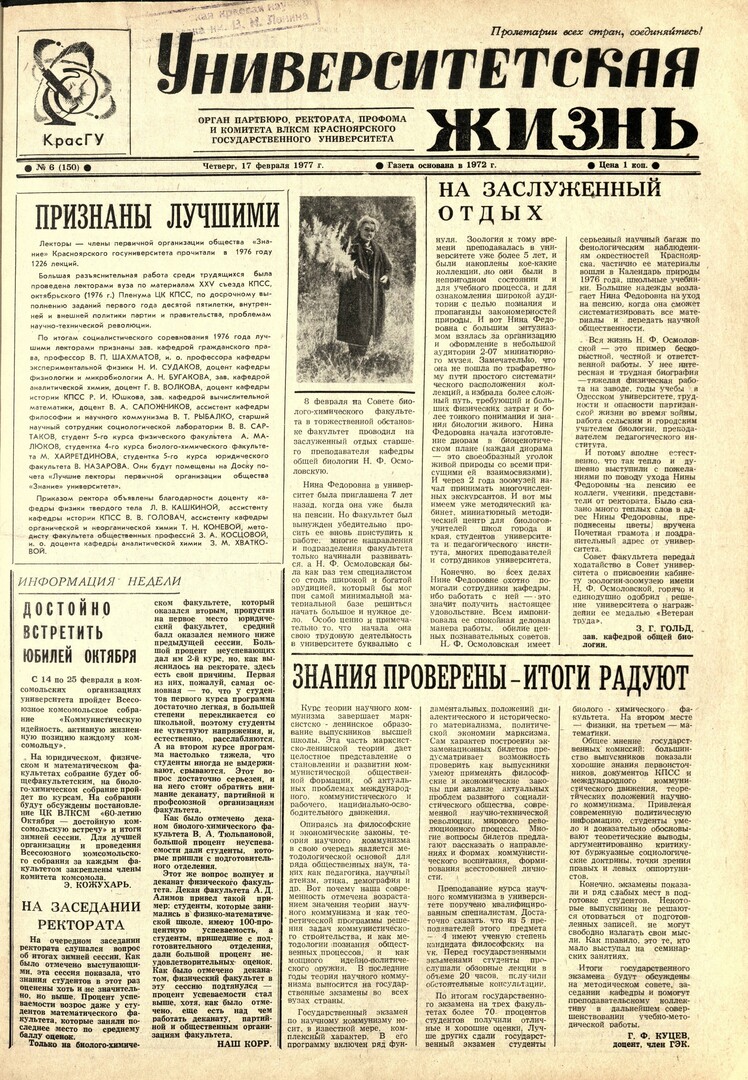 Университетская жизнь : газета. 1977 г. № 6 (150) (17 февраля)выпуск журнала/газеты