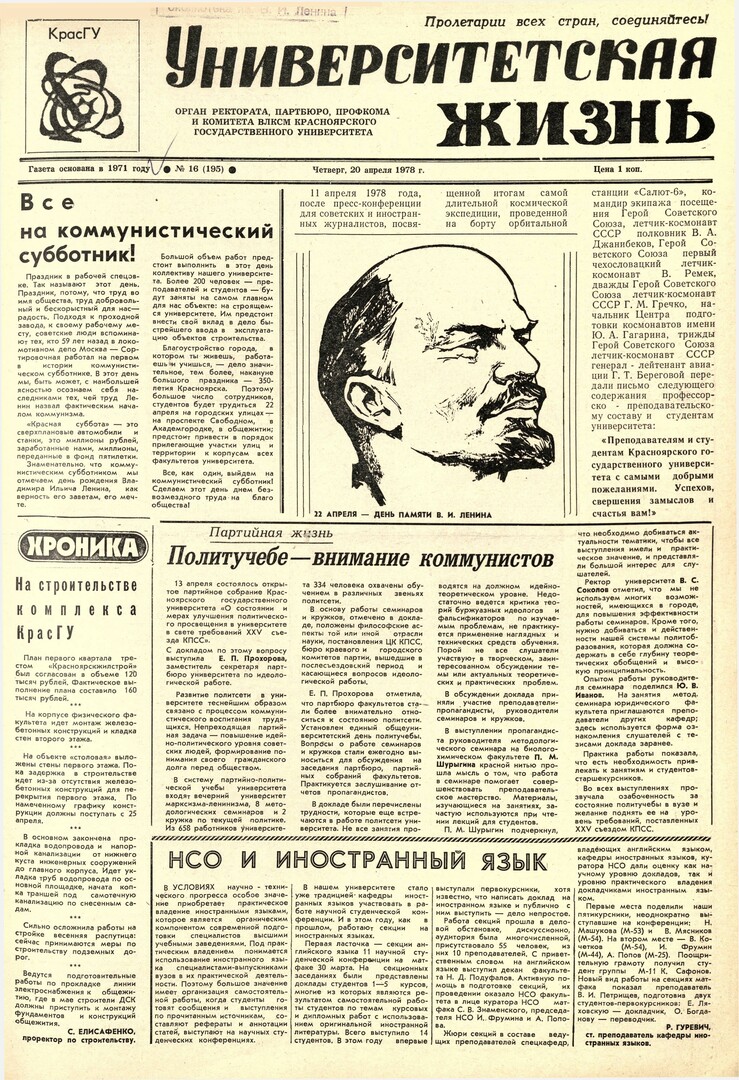 Библиографическое описание:Университетская жизнь : газета/ Красноярский государственный университет. - Красноярск : КрасГУ, 1972 - - 2006 1978г. N 16 (195) (20 апреля)