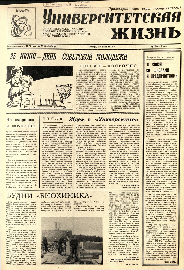 Библиографическое описание:Университетская жизнь : газета/ Красноярский государственный университет. - Красноярск : КрасГУ, 1972 - - 2006 1978г. N 23 (202) (22 июня)