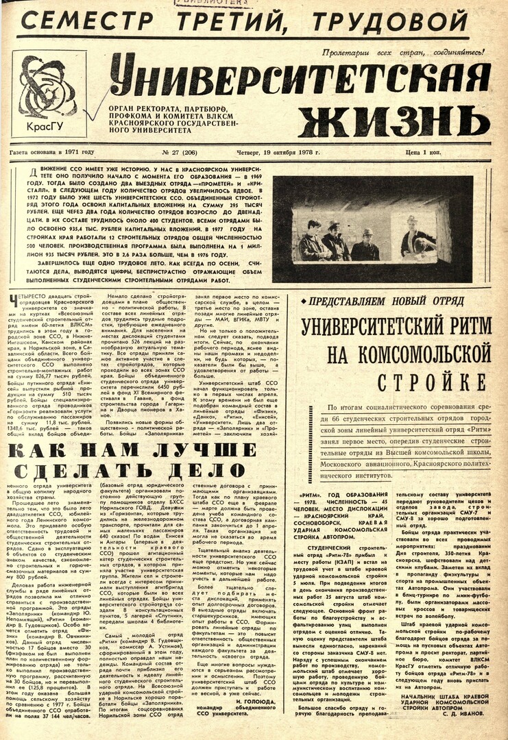 Библиографическое описание:Университетская жизнь : газета/ Красноярский государственный университет. - Красноярск : КрасГУ, 1972 - - 2006 1978г. N 27 (206) (19 октября)