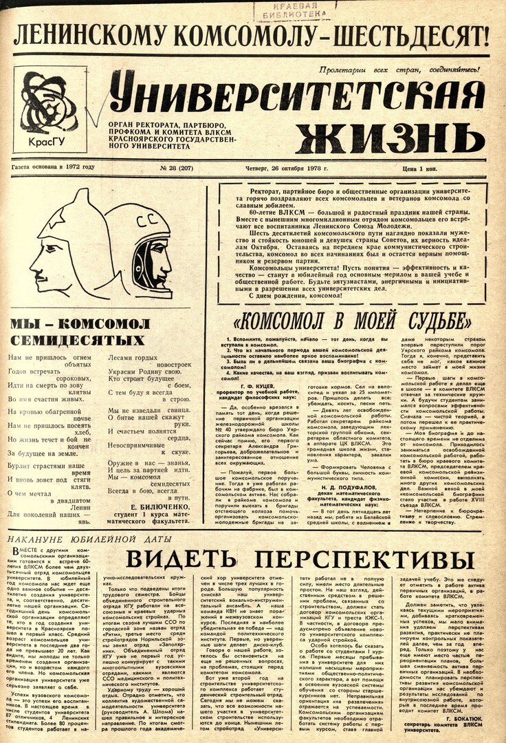 Библиографическое описание:Университетская жизнь : газета/ Красноярский государственный университет. - Красноярск : КрасГУ, 1972 - - 2006 1978г. N 28 (207) (26 октября)