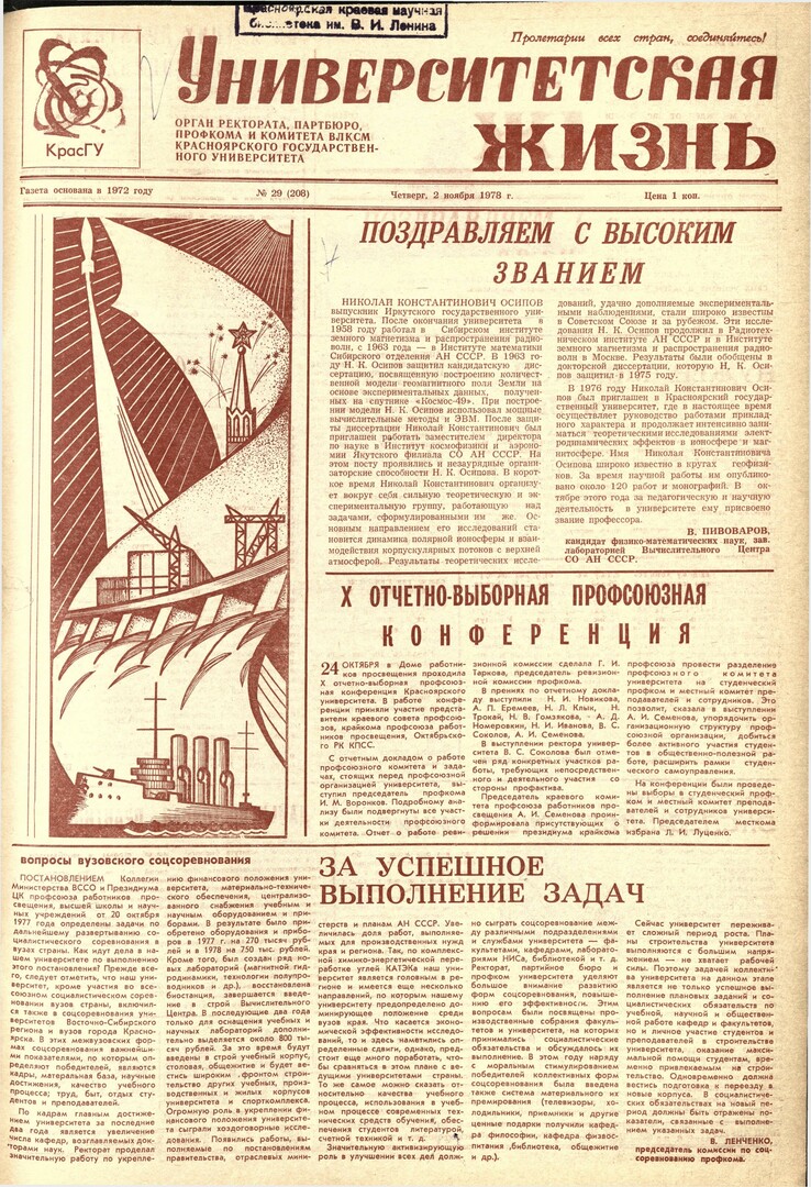Библиографическое описание:Университетская жизнь : газета/ Красноярский государственный университет. - Красноярск : КрасГУ, 1972 - - 2006 1978г. N 29 (208) (2 ноября)