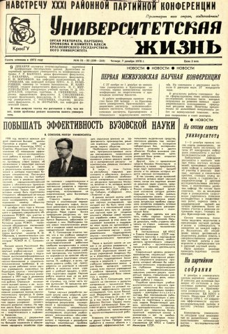 Библиографическое описание:Университетская жизнь : газета/ Красноярский государственный университет. - Красноярск : КрасГУ, 1972 - - 2006 1978г. N 31/32 (209-210) (7 декабря)
