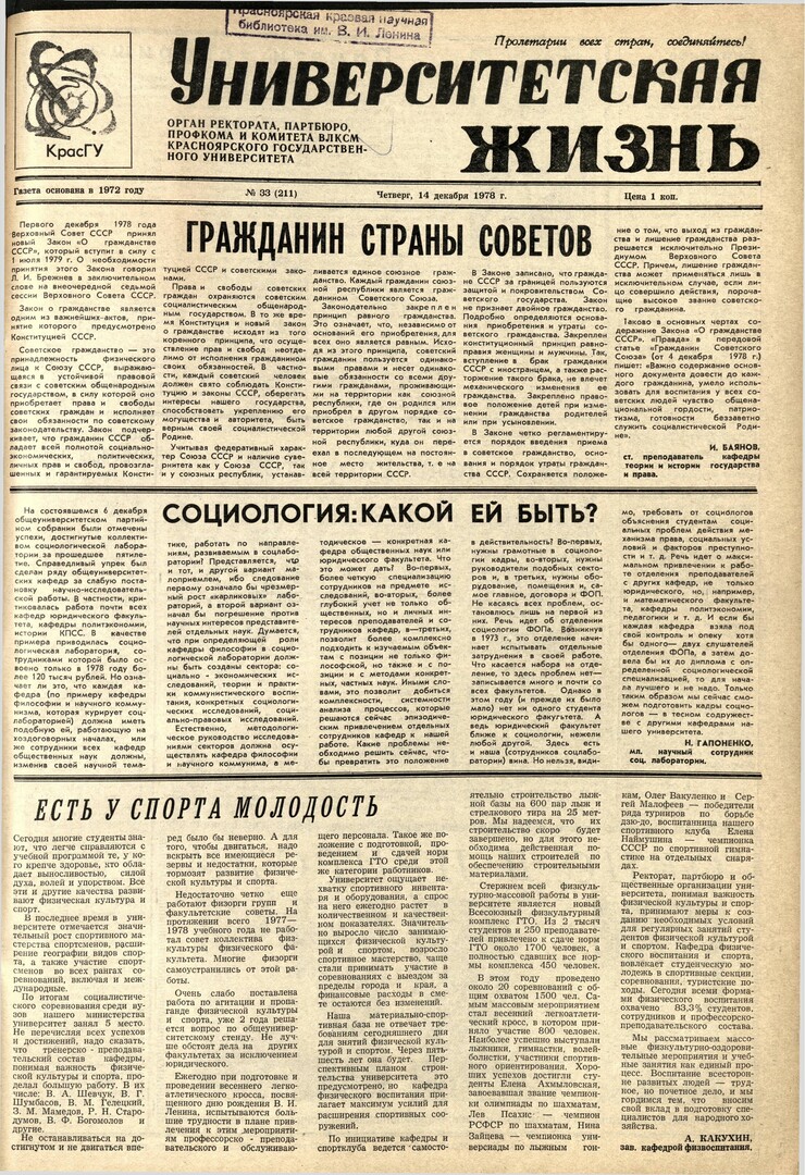 Библиографическое описание:Университетская жизнь : газета/ Красноярский государственный университет. - Красноярск : КрасГУ, 1972 - - 2006 1978г. N 33 (211) (14 декабря)