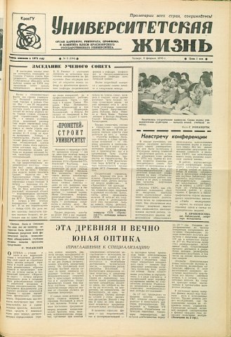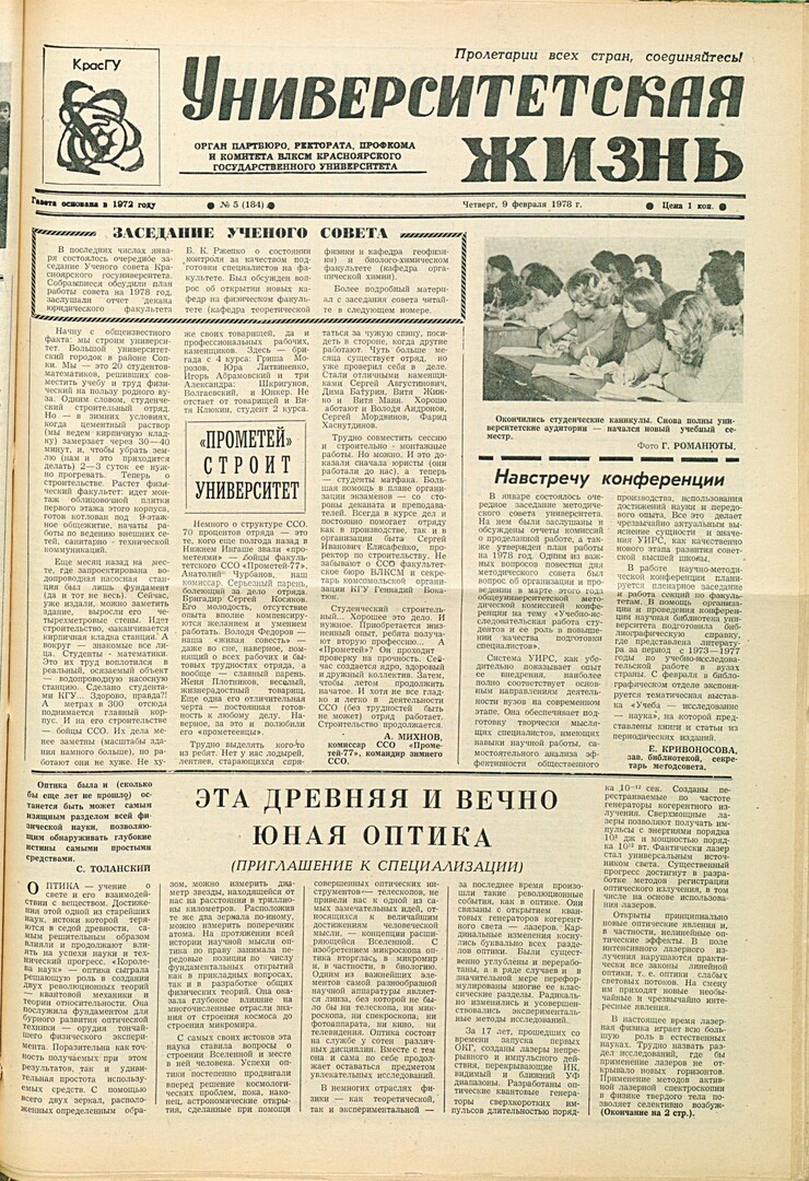 Библиографическое описание:Университетская жизнь : газета/ Красноярский государственный университет. - Красноярск : КрасГУ, 1972 - - 2006 1978г. N 5 (184) (9 февраля)