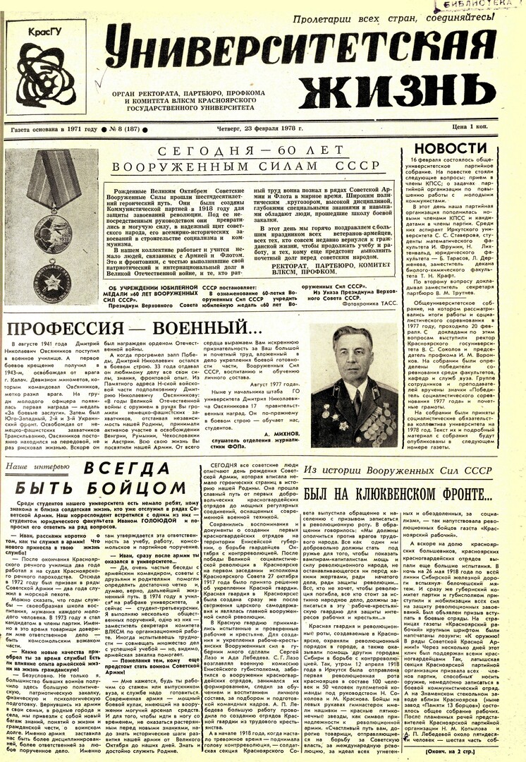 Библиографическое описание:Университетская жизнь : газета/ Красноярский государственный университет. - Красноярск : КрасГУ, 1972 - - 2006 1978г. N 8 (187) (23 февраля)