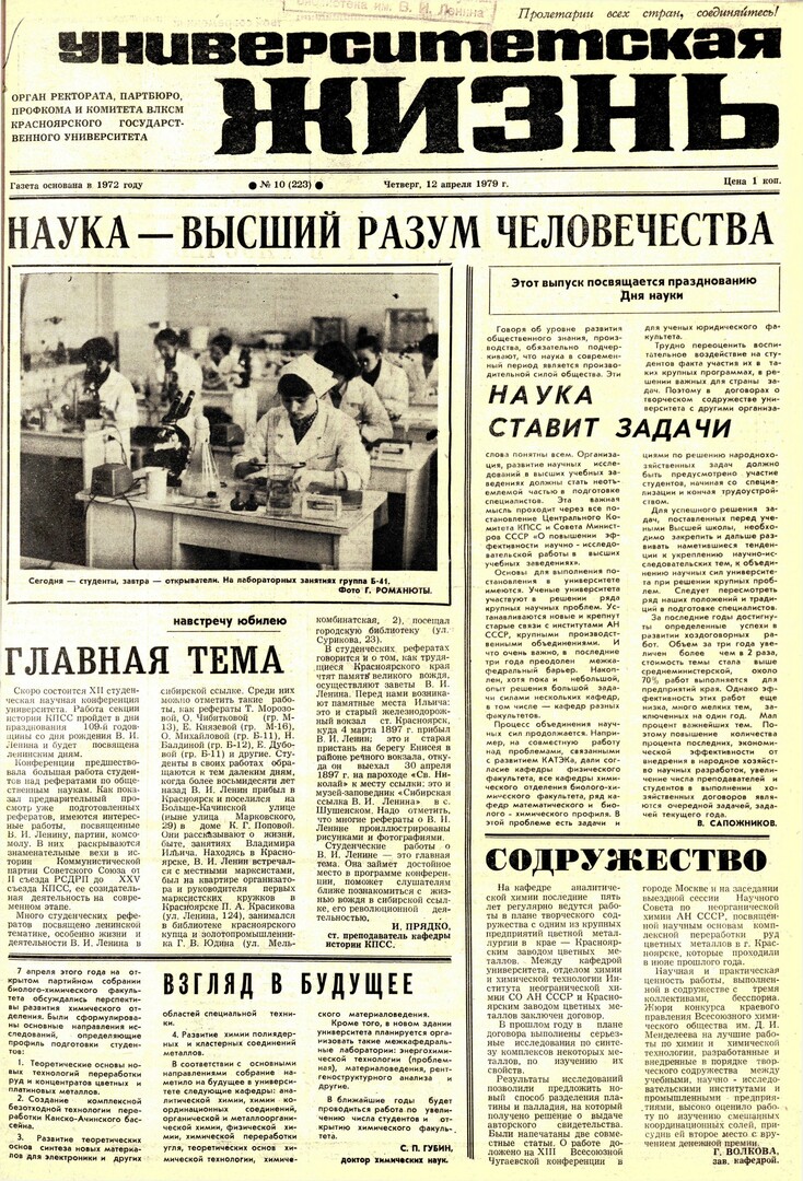 Библиографическое описание:Университетская жизнь : газета/ Красноярский государственный университет. - Красноярск : КрасГУ, 1972 - - 2006 1979г. N 10 (223) (12 апреля)