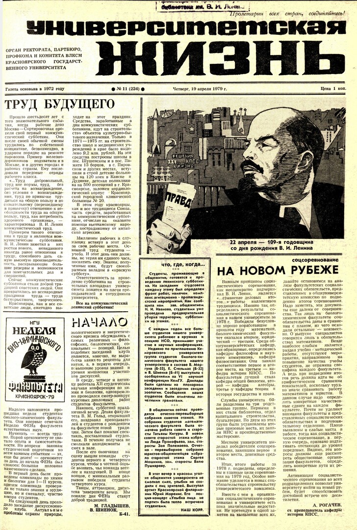 Библиографическое описание:Университетская жизнь : газета/ Красноярский государственный университет. - Красноярск : КрасГУ, 1972 - - 2006 1979г. N 11 (224) (19 апреля)