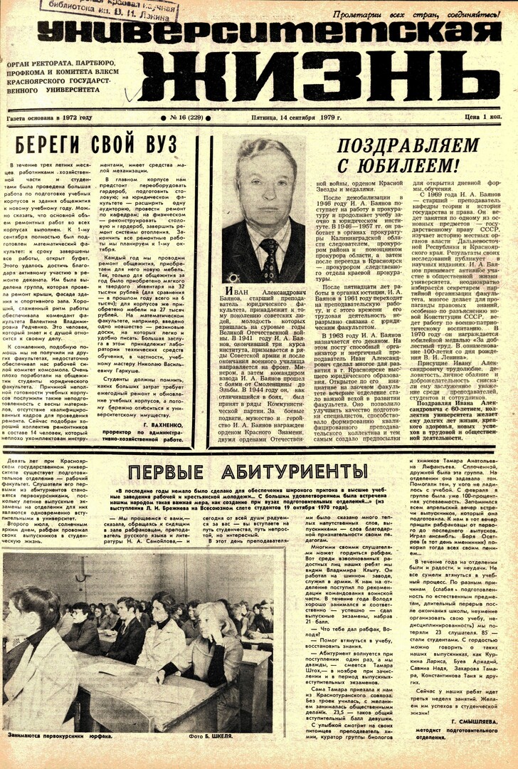 Библиографическое описание:Университетская жизнь : газета/ Красноярский государственный университет. - Красноярск : КрасГУ, 1972 - - 2006 1979г. N 16 (229) (14 сентября)