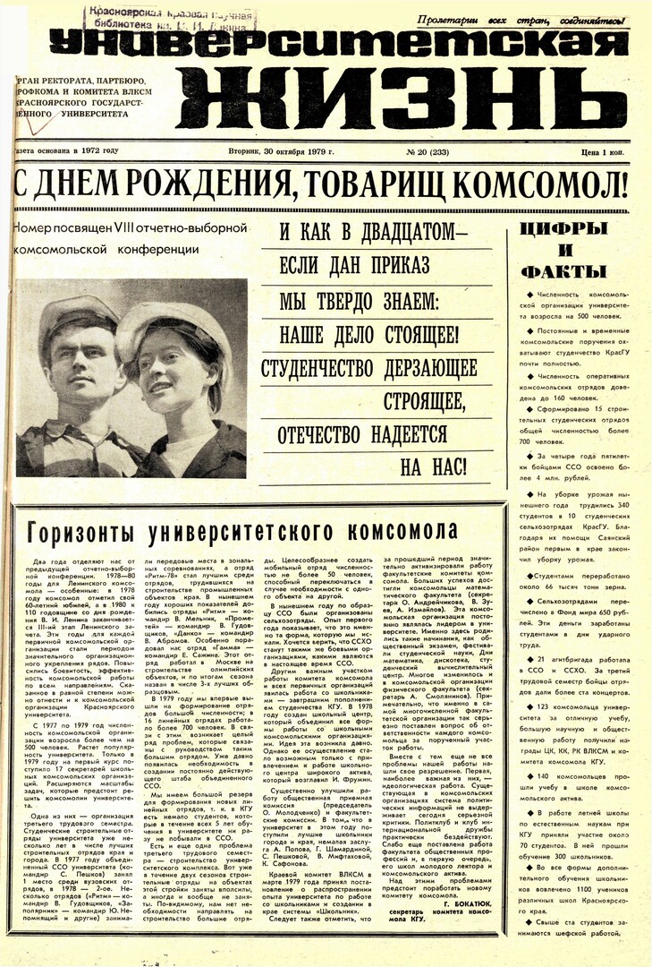 Библиографическое описание:Университетская жизнь : газета/ Красноярский государственный университет. - Красноярск : КрасГУ, 1972 - - 2006 1979г. N 20 (233) (30 октября)