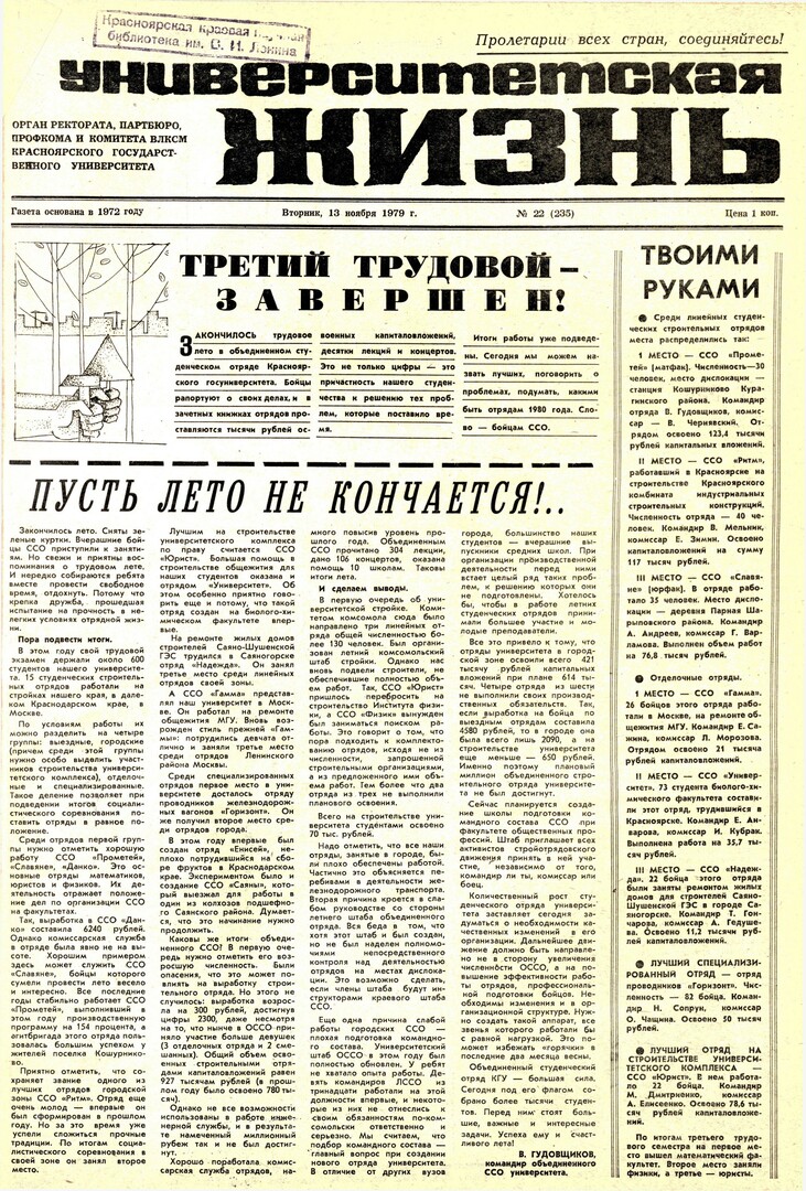 Библиографическое описание:Университетская жизнь : газета/ Красноярский государственный университет. - Красноярск : КрасГУ, 1972 - - 2006 1979г. N 22 (235) (13 ноября)