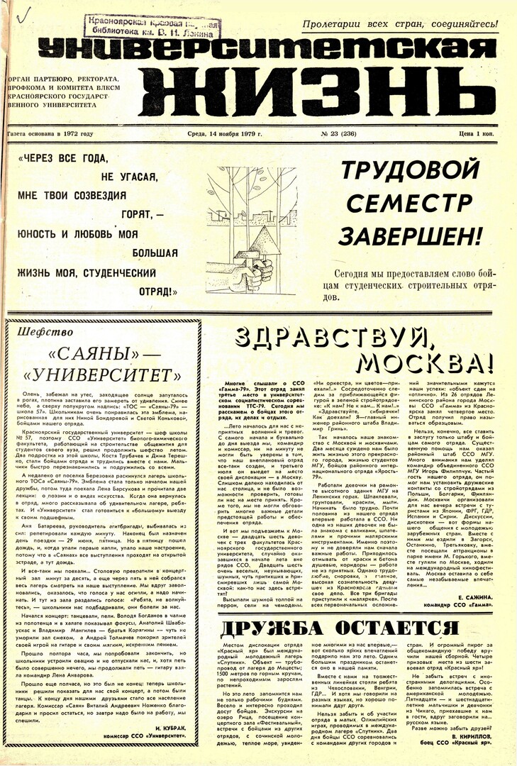 Библиографическое описание:Университетская жизнь : газета/ Красноярский государственный университет. - Красноярск : КрасГУ, 1972 - - 2006 1979г. N 23 (236) (14 ноября)