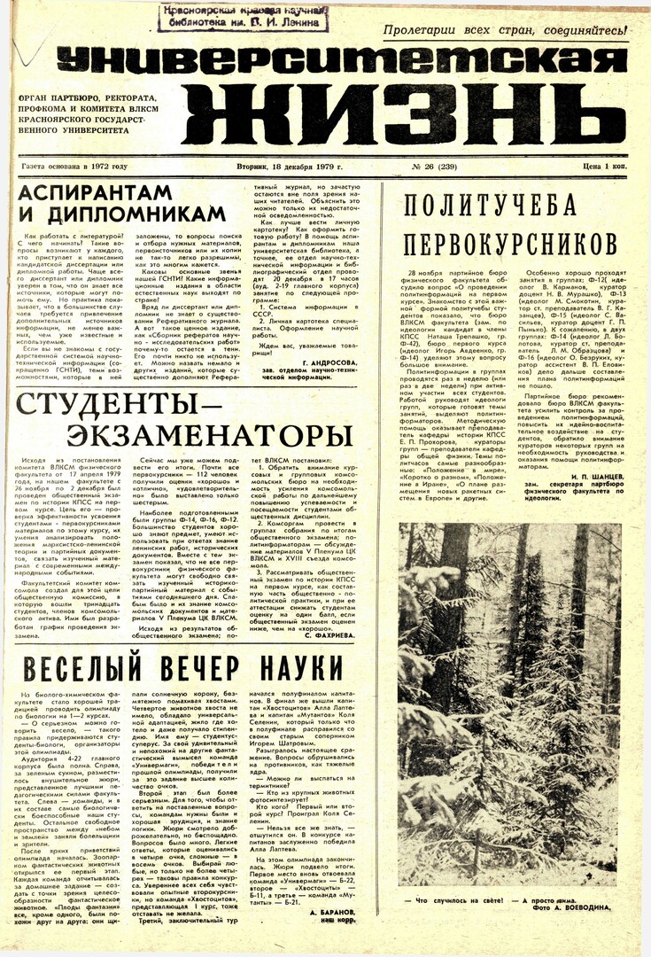 Библиографическое описание:Университетская жизнь : газета/ Красноярский государственный университет. - Красноярск : КрасГУ, 1972 - - 2006 1979г. N 26 (239) (18 декабря)