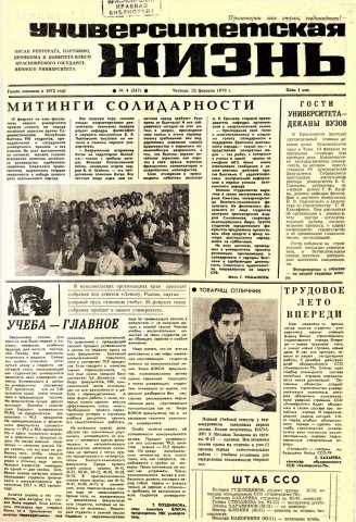 Библиографическое описание:Университетская жизнь : газета/ Красноярский государственный университет. - Красноярск : КрасГУ, 1972 - - 2006 1979г. N 4 (217) (22 февраля)
