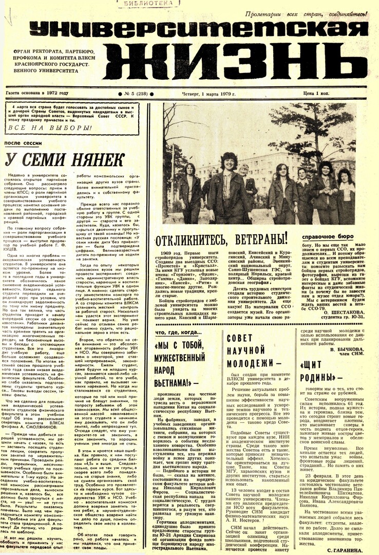 Библиографическое описание:Университетская жизнь : газета/ Красноярский государственный университет. - Красноярск : КрасГУ, 1972 - - 2006 1979г. N 5 (218) (1 марта)
