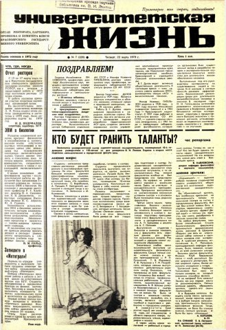 Библиографическое описание:Университетская жизнь : газета/ Красноярский государственный университет. - Красноярск : КрасГУ, 1972 - - 2006 1979г. N 7 (220) (22 марта)