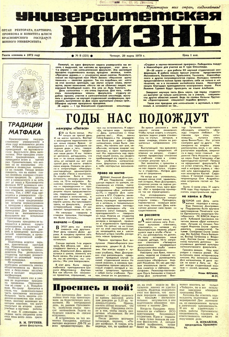 Библиографическое описание:Университетская жизнь : газета/ Красноярский государственный университет. - Красноярск : КрасГУ, 1972 - - 2006 1979г. N 8 (221) (29 марта)