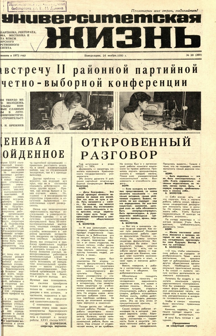 - Откровенный разговор : [интервью с секретарем комитета комсомола КрасГУ]. — С. 1-2.В. А. Болотов ; записала О. Изюрьева