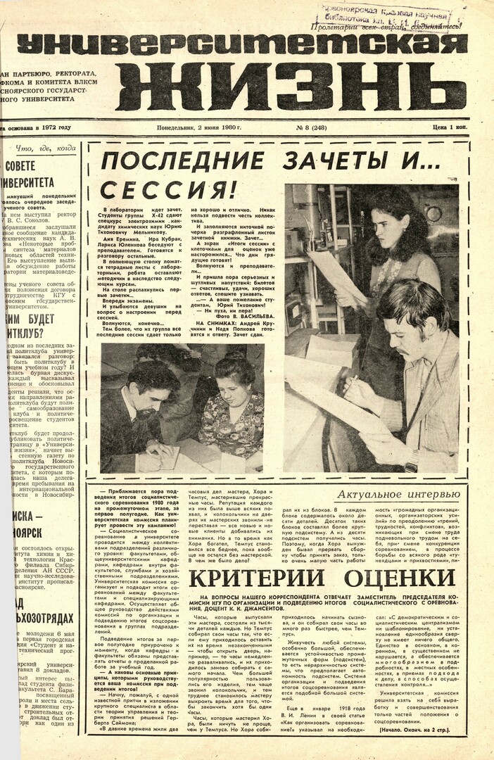 - Последние зачеты и... сессия! : [на снимках к заметке: Андрей Кручинин и Надя Попкова готовятся к ответу ; Зачет сдан (Ю. Т. Мельников и студентка)]. — С. 1.