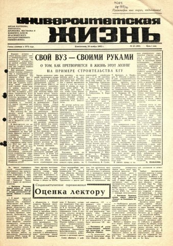 Университетская жизнь : газета/ Красноярский государственный университет. - Красноярск : КрасГУ, 1972 - - 2006 1982г. N 15 (305) (29 ноября) Полный текст ( 9.5 Мб; PDF). Ресурс свободного доступа