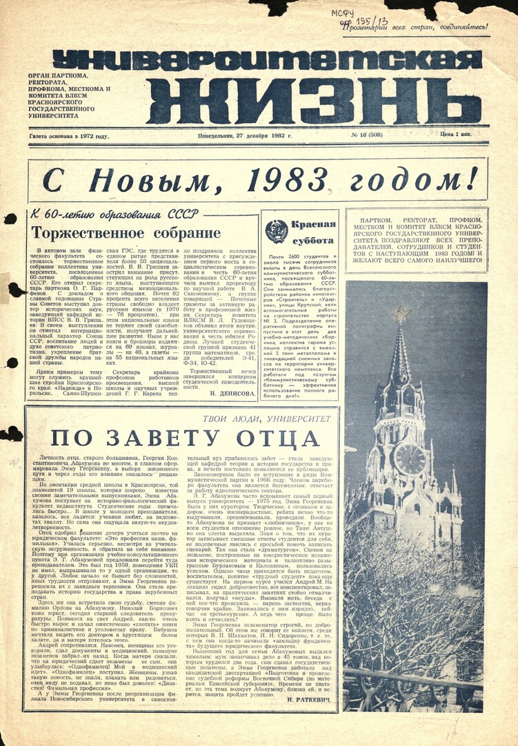 Университетская жизнь : газета/ Красноярский государственный университет. - Красноярск : КрасГУ, 1972 - - 2006 1982г. N 18 (308) (27 декабря) Полный текст ( 8.9 Мб; PDF). Ресурс свободного доступа