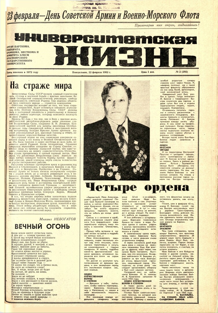 Библиографическое описание:Университетская жизнь : газета/ Красноярский государственный университет. - Красноярск : КрасГУ, 1972 - - 2006 1982г. N 2 (292) (22 февраля)