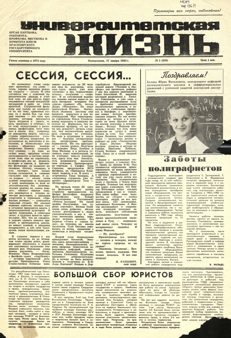 Университетская жизнь : газета/ Красноярский государственный университет. - Красноярск : КрасГУ, 1972 - - 2006 1983г. N 1 (309) (17 января) Полный текст ( 9.0 Мб; PDF). Ресурс свободного доступа