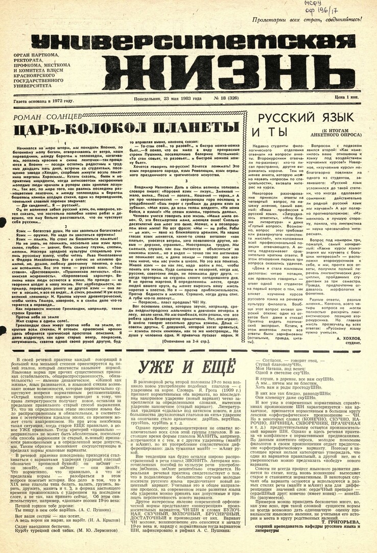 Университетская жизнь : газета/ Красноярский государственный университет. - Красноярск : КрасГУ, 1972 - - 2006 1983г. N 18 (326) (23 мая) Полный текст ( 9.0 Мб; PDF). Ресурс свободного доступа