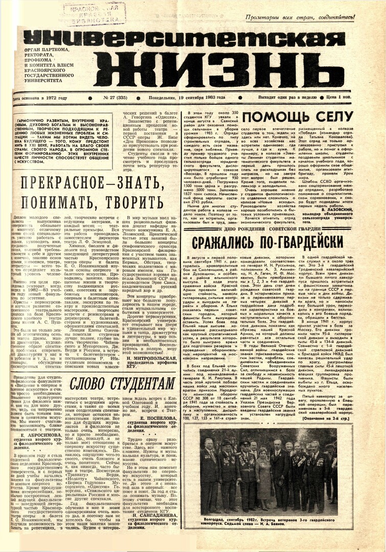 Библиографическое описание:Университетская жизнь : газета/ Красноярский государственный университет. - Красноярск : КрасГУ, 1972 - - 2006 1983г. N 27 (335) (19 сентября)