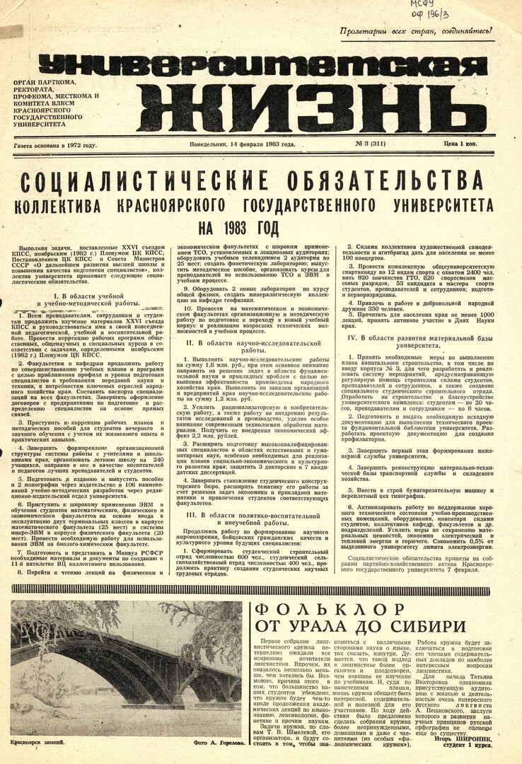 Университетская жизнь : газета / Красноярский государственный университет. - Красноярск : КрасГУ, 1972 - - 2006 1983г. N 3 (311) (14 февраля) Полный текст ( 10.1 Мб; PDF). Ресурс свободного доступа