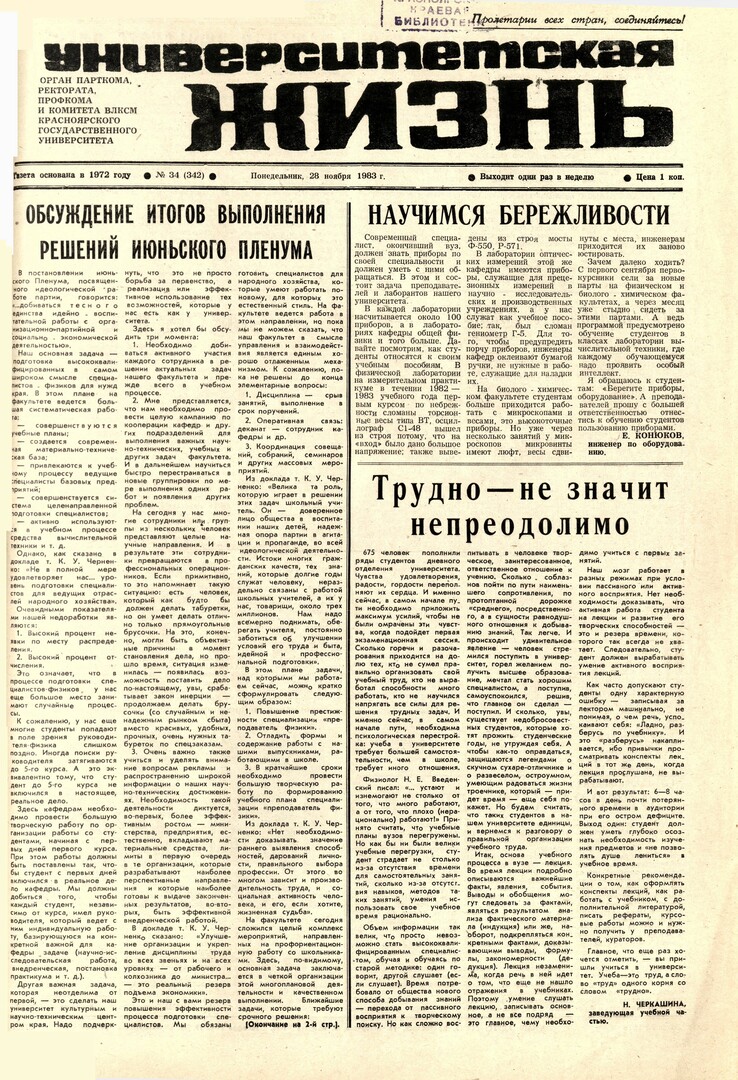 Библиографическое описание:Университетская жизнь : газета/ Красноярский государственный университет. - Красноярск : КрасГУ, 1972 - - 2006 1983г. N 34 (342) (28 ноября)