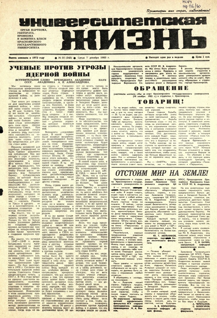 Университетская жизнь : газета/ Красноярский государственный университет. - Красноярск : КрасГУ, 1972 - - 2006 1983г. N 35 (343) (7 декабря) Полный текст ( 8.8 Мб; PDF). Ресурс свободного доступа