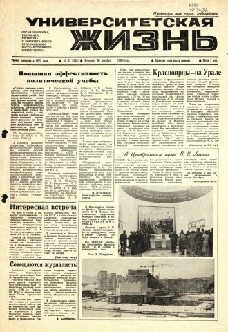 Университетская жизнь : газета/ Красноярский государственный университет. - Красноярск : КрасГУ, 1972 - - 2006 1983г. N 37 (345) (20 декабря) Полный текст ( 10.3 Мб; PDF). Ресурс свободного доступа