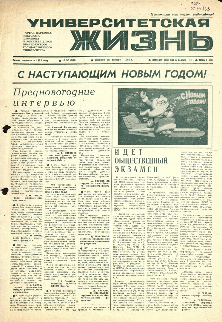 Университетская жизнь : газета / Красноярский государственный университет. - Красноярск : КрасГУ, 1972 - - 2006 1983г. N 38 (346) (27 декабря) Полный текст ( 8.4 Мб; PDF). Ресурс свободного доступа