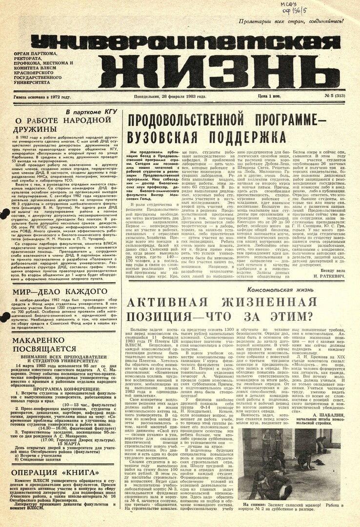 Университетская жизнь : газета. 1983 г. № 5 (313) (28 февраля)